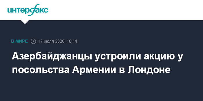 Москва. 17 июля. INTERFAX.RU - В Лондоне 150 уроженцев Азербайджана устроили акцию протеста у посольства Армении, сообщили в азербайджанском посольстве. Протестующие осудили действия армянских военных на границе с Товузовским районом Азербайджана.