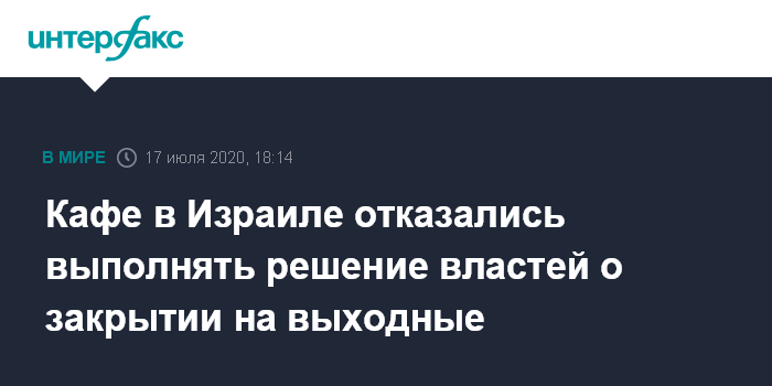 Москва. 17 июля. INTERFAX.RU - Израильские заведения общественного питания выступили против решения правительства страны закрыть их для посетителей на выходные и заявили, что не намерены ему подчиняться, пишет газета The Times of Israel.