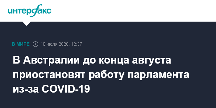 Москва. 18 июля. INTERFAX.RU - Парламент Австралии в связи с ситуацией вокруг коронавируса как минимум до 24 августа не будет собираться на заседания, сообщают в субботу западные СМИ.