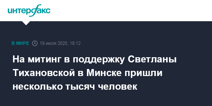 Москва. 19 июля. INTERFAX.RU - Кандидат в президенты Белоруссии Светлана Тихановская в воскресенье в парке Дружбы в Минске провела свой первый агитационный митинг, на который пришли несколько тысяч человек.