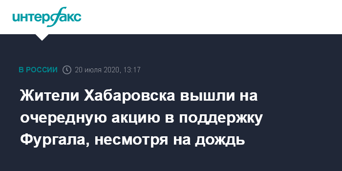 Как сообщалось, с 11 июля в Хабаровске проходят несанкционированные уличные акции в поддержку губернатора Сергея Фургала. Самые массовые митинги и шествия прошли 11 и 18 июля, когда, по данным полиции и мэрии, собирались до 12 тыс. человек.