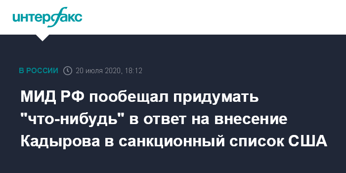 Москва. 20 июля. INTERFAX.RU - В МИД РФ заявили, что придумают вариант ответа на внесение главы Чечни Рамзана Кадырова в санкционный список госдепа США, но принять зеркальные меры будет сложно.