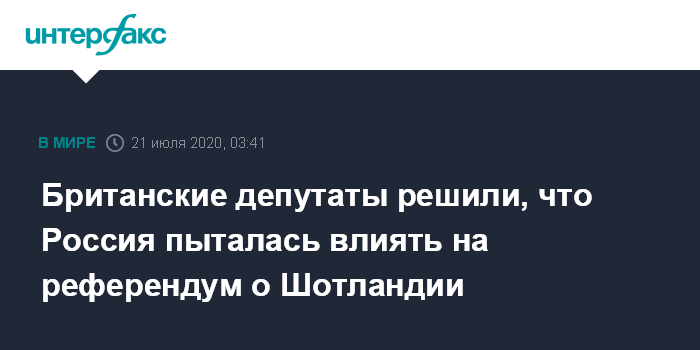 Москва. 21 июля. INTERFAX.RU - Британские депутаты пришли к выводу, что Россия пыталась повлиять на результаты референдума о независимости Шотландии, но не на голосование по Brexit, сообщает The Daily Telegraph, которой удалось ознакомиться с докладом парламентского комитета по деятельности служб разведки и безопасности.