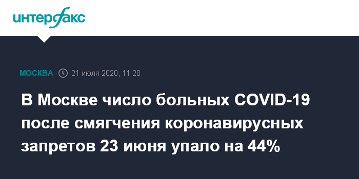 В Москве число больных COVID-19 после смягчения коронавирусных запретов 23 июня упало на 44%