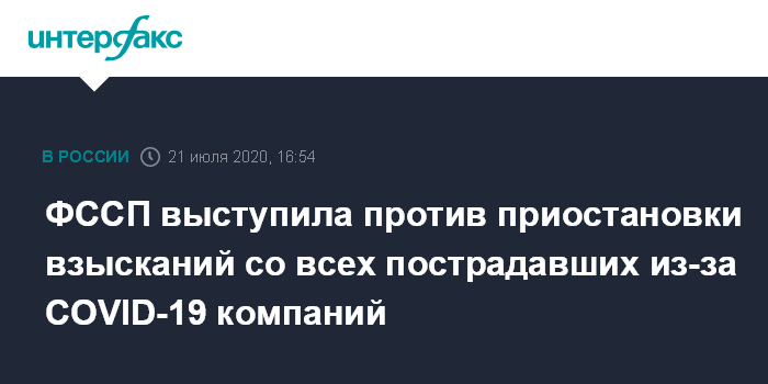 Москва. 21 июля. INTERFAX.RU - Федеральная служба судебных приставов (ФССП) РФ не считает правильным приостанавливать исполнительные производства в отношении всех компаний и индивидуальных предпринимателей (ИП) из наиболее пострадавших от пандемии COVID-19 отраслей в отсутствие дела о несостоятельности, рассказал источник "Интерфакса".