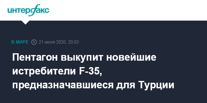 Москва. 21 июля. INTERFAX.RU - Военно-воздушные силы США решили выкупить истребители пятого поколения F-35, которые предназначались для поставки Турции. Об этом сообщило издание Defense News, ссылаясь на источники в Пентагоне.