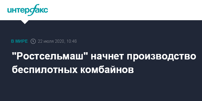 Москва. 22 июля. INTERFAX.RU - Компания "Ростсельмаш" планирует в 2021 году начать выпускать беспилотные комбайны, сообщил "Интерфаксу" руководитель проекта инновационных технологий компании Олег Александров.