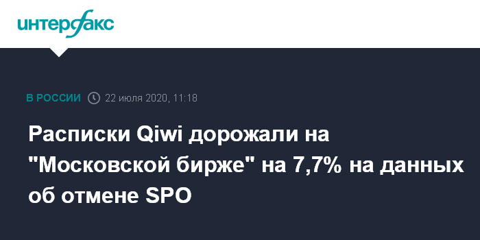 Расписки Qiwi дорожали на "Московской бирже" на 7,7% на данных об отмене SPO