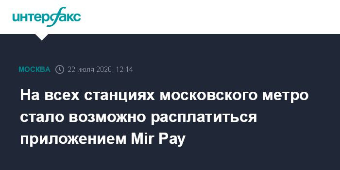 Москва. 22 июля. INTERFAX.RU - Москвичи смогут расплатиться за поездку в метро приложением Mir Pay на любой станции.