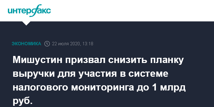Москва. 22 июля. INTERFAX.RU - Премьер-министр Михаил Мишустин в ходе отчета в Госдуме в среду предложил снизить планку размера годовой выручки и активов, при достижении которых компании могут претендовать на участие в системе налогового мониторинга.