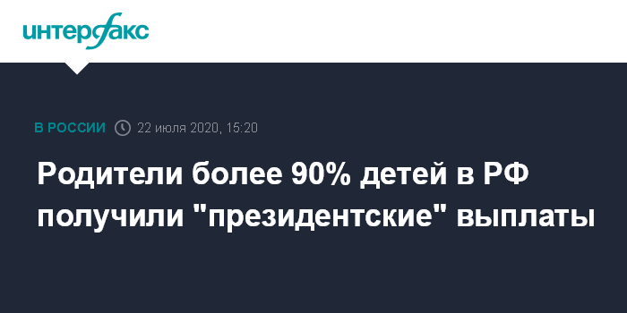 Москва. 22 июля. INTERFAX.RU - Глава Пенсионного фонда России Максим Топилин заявил, что дополнительные выплаты на детей до 16 лет в России уже назначены порядка 90% потенциальных получателей.