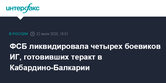 Москва. 22 июля. INTERFAX.RU - ФСБ сообщает о пресечении подготовки теракта в отношении сотрудников правоохранительных органов в Кабардино-Балкарии. Планировавшие его боевики запрещенной в РФ организации ИГ ("Исламское государство") уничтожены в бою.
