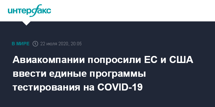 Москва. 22 июля. INTERFAX.RU - Несколько авиакомпаний обратились к руководству Европейского союза и США с просьбой ввести единые программы тестирования на коронавирусную инфекцию COVID-19.