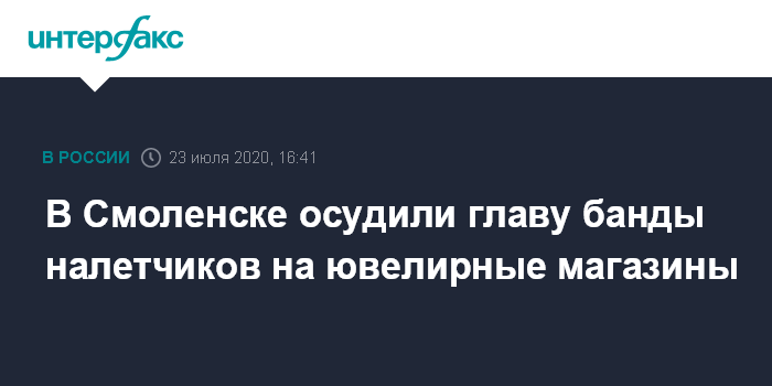 Москва. 23 июля. INTERFAX.RU - Смоленский областной суд вынес приговор жителю Ленинградской области за организацию серии разбойных нападений на ювелирные магазины Северо-Западного и Центрального федеральных округов. Обь этом сообщила пресс-служба прокуратуры Смоленской области.
