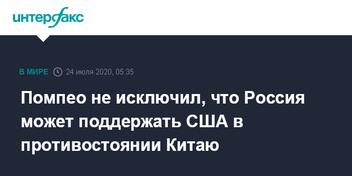 Москва. 24 июля. INTERFAX.RU - Госсекретарь США Майк Помпео считает, что Россия может совместно с США выступить против политики Китая на мировой арене.