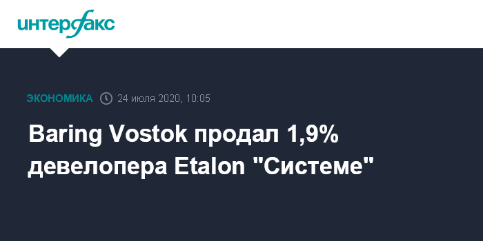 Москва. 24 июля. INTERFAX.RU - Фонды семейства Baring Vostok продали 1,9% акций Etalon Group, говорится в сообщении девелопера на Лондонской фондовой бирже. Пакет перешел к АФК "Система".