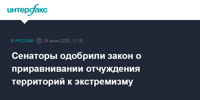 Москва. 24 июля. INTERFAX.RU - Совет Федерации одобрил закон о признании экстремизмом нарушение территориальной целостности России, в том числе отчуждение части ее территории. Закон принят в соответствии с новыми нормами Конституции.