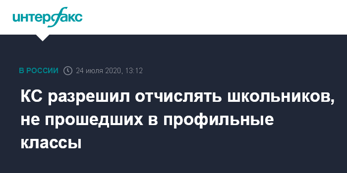 Москва. 24 июля. INTERFAX.RU - Конституционный суд признал соответствующими основному закону нормы, которые позволяют школам отчислять учеников, не прошедших отбор в профильные классы. Чиновники органов, занимающихся системой образования, обязаны найти таким детям другие школы, а также информировать родителей об отборе.