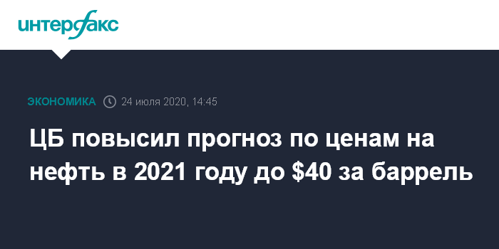 Москва. 24 июля. INTERFAX.RU - ЦБ РФ существенно повысил свой прогноз по среднегодовым ценам на нефть марки Urals в 2020 году до $38 за баррель с $27, говорится в среднесрочном прогнозе ЦБ, опубликованном по итогам заседания совета директоров, на котором он понизил ключевую ставку до 4,25% с 4,5%.