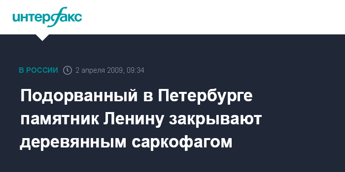 Москва. 2 апреля. INTERFAX.RU - Памятник В.И.Ленину у Финляндского вокзала Петербурга, подорванный накануне, в четверг утром обшивают деревянными досками, передает с места события корреспондент "Интерфакса".