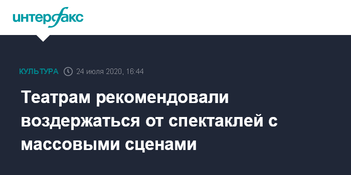 Москва. 24 июля. INTERFAX.RU - Театрам и концертным площадкам после возвращения к работе рекомендовано отменить спектакли и концерты с массовыми сценами, а на репетициях соблюдать социальную дистанцию.