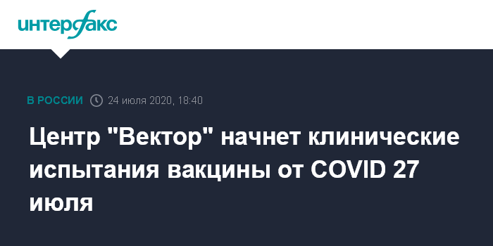 "Центр "Вектор" Роспотребнадзора получил 24 июля разрешение на проведение клинических испытаний вакцины, первые добровольцы будут вакцинированы 27 июля в рамках протокола клинических испытаний", - говорится в сообщении пресс-службы ведомства в пятницу.