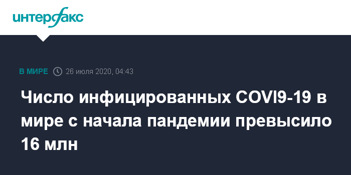 Москва. 26 июля. INTERFAX.RU - По состоянию на 04:00 по московскому времени воскресенья с начала пандемии COVI9-19 во всем мире зафиксировано 16 189 617 случаев заражения коронавирусом, сообщил портал Worldometer.