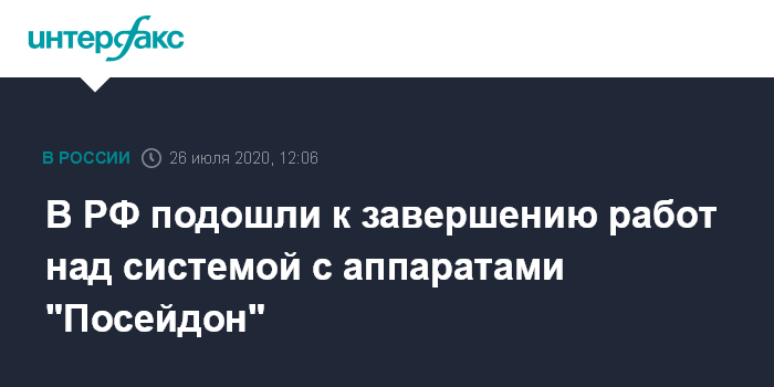 Москва. 26 июля. INTERFAX.RU - Российские военные сообщили, что работы по созданию океанской системы с ядерными подлодками-беспилотниками "Посейдон" завершаются.