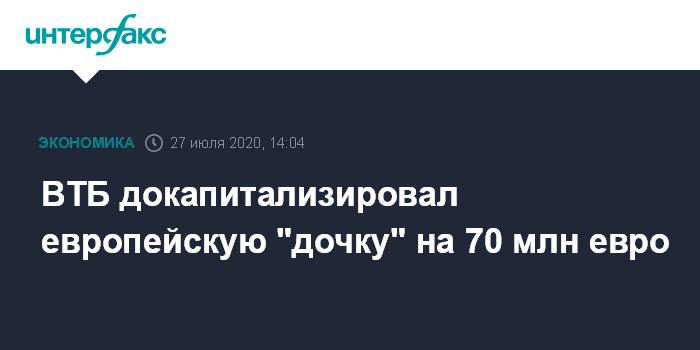 Москва. 27 июля. INTERFAX.RU - ВТБ в январе докапитализировал европейскую "дочку" на 70 млн евро, планирует еще одну докапитализацию во второй половине 2020 года, сообщили "Интерфаксу" в пресс-службе российского банка.