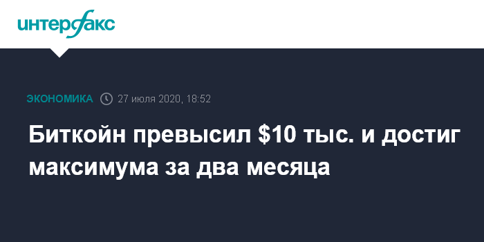 Москва. 27 июля. INTERFAX.RU - Курс биткойна поднялся выше отметки $10 тыс., что является максимумом примерно за два месяца.