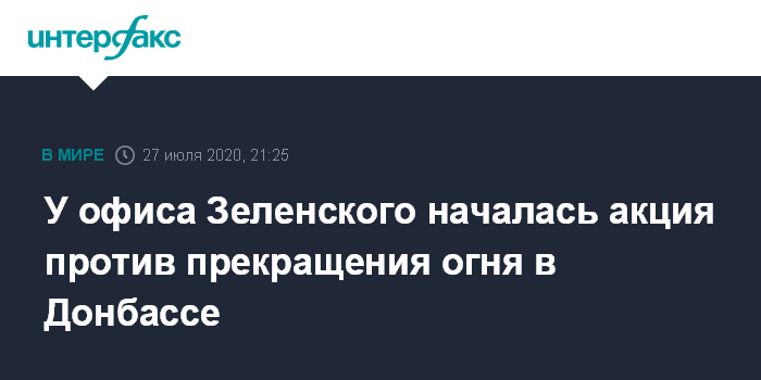 Москва. 27 июля. INTERFAX.RU - У офиса президента Украины Владимира Зеленского в понедельник вечером проходит акция против реализации последних договоренностей, достигнутых в Минске в рамках Трехсторонней контактной группы по режиму прекращения огня в Донбассе.