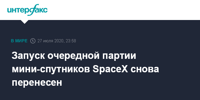Москва. 27 июля. INTERFAX.RU - Американская компания SpaceX перенесла на 1 августа запуск ракеты-носителя Falcon 9 с очередной партией из 57 мини-спутников для продолжения развертывания глобальной сети интернет-покрытия системы Starlink 1 августа, сообщил специализированный сайт Spaceflight Now.