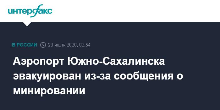 Москва. 28 июля. INTERFAX.RU - Пассажиры и персонал аэропорта Южно-Сахалинска эвакуированы во вторник утром из-за поступившей информации о минировании здания аэровокзала, сообщили агентству "Интерфакс" в пресс-службе аэропорта.