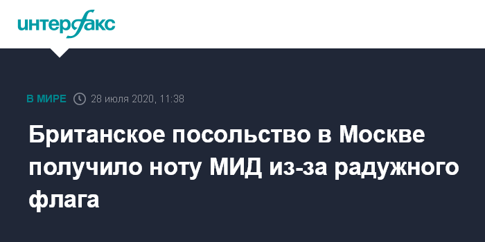 Москва. 28 июля. INTERFAX.RU - Британское посольство в Москве получило ноту протеста от российского МИД за то, что на здании дипмиссии в июне был вывешен флаг ЛГБТ, сообщил "Интерфаксу" дипломатический источник.