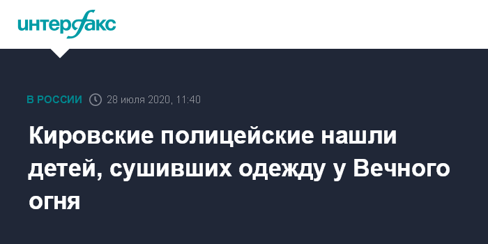 Москва. 28 июля. INTERFAX.RU - Сотрудники полиции установили личности детей, сушивших одежду около Вечного огня в Кирове.