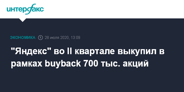 Москва. 28 июля. INTERFAX.RU - Интернет-компания "Яндекс" выкупила с рынка 700 тысяч акций класса А во II квартале 2020 года в рамках ранее объявленной программы buyback на общую сумму до $300 млн, говорится в сообщении компании.