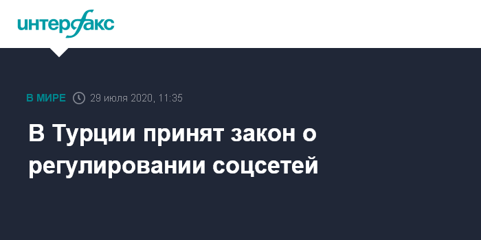 Москва. 29 июля. INTERFAX.RU - Парламент Турции принял закон о регулировании работы соцсетей в стране, обязывает их владельцев блокировать запрещенную информацию и устанавливает штрафы за нарушения, сообщает Anadolu.