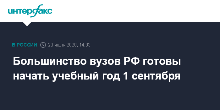 Москва. 29 июля. INTERFAX.RU - Начало учебного года на 14 сентября перенесли 8% высших учебных заведений РФ, остальные вузы выразили готовность начать учебный год с 1 сентября, сообщила вице-премьер Татьяна Голикова.