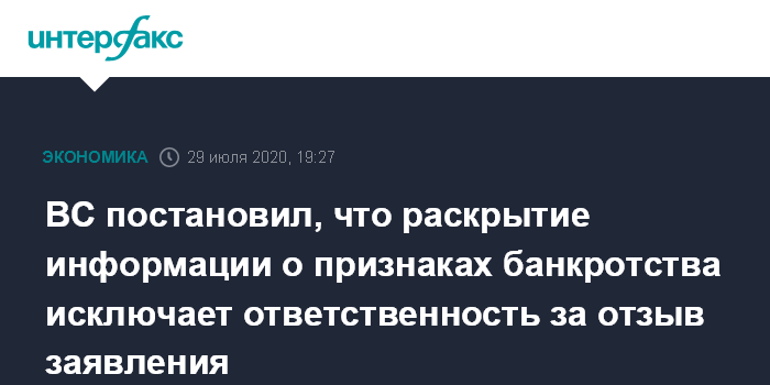 ВС постановил, что раскрытие информации о признаках банкротства исключает ответственность за отзыв заявления