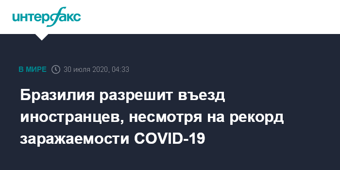 Москва. 30 июля. INTERFAX.RU - Бразильское правительство разрешает иностранцам въезжать в страну воздушным транспортом в соответствии с указом, изданным через несколько часов после того, как было сообщено о рекордном количестве новых случаев заболевания COVID-19.
