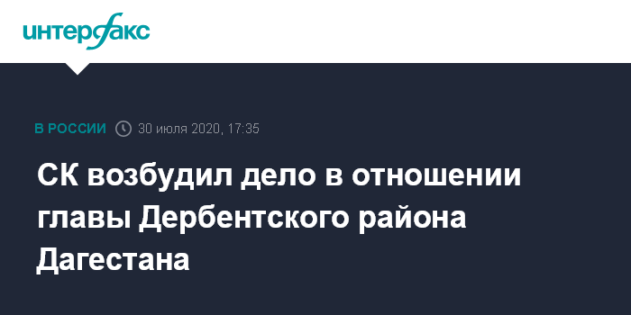 Москва. 30 июля. INTERFAX.RU - Следственные органы в Дагестане возбудили уголовное дело в отношении главы Дербентского района. Об этом сообщил "Интерфаксу" старший помощник руководителя СУ СКР по республике Расул Темирбеков.