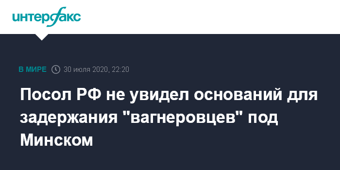 Москва. 30 июля. INTERFAX.RU - Посол РФ в Минске Дмитрий Мезенцев заявил, что не видит реальных оснований для задержания 33 граждан РФ, которых белорусские власти считают боевиками частной военной компании (ЧВК) "Вагнер".