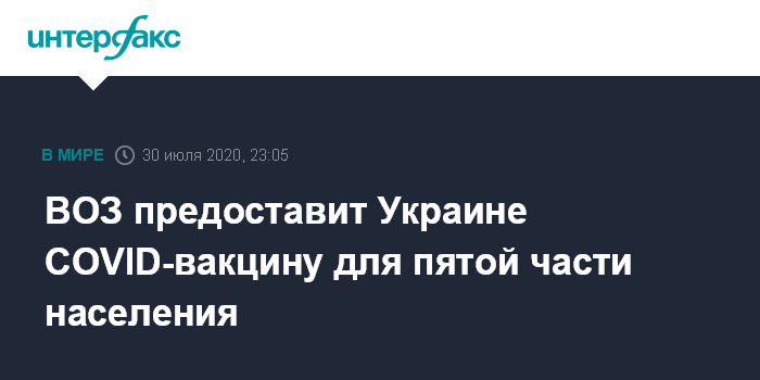 Москва. 30 июля. INTERFAX.RU - Украина участвует в программе Всемирной организации здравоохранения (ВОЗ) по глобальному доступу к вакцине от коронавируса, после чего должна будет получить дозы для 20% населения страны, заявил главный санитарный врач страны Виктор Ляшко.