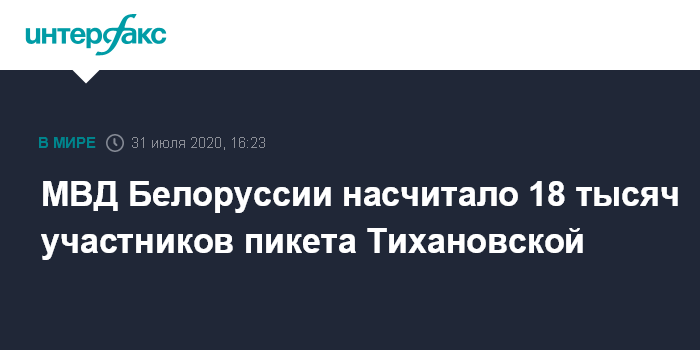 Москва. 31 июля. INTERFAX.RU - В предвыборном пикете кандидата в президенты Белоруссии Светланы Тихановской 30 июля в Минске приняли участие чуть больше 18 тысяч человек, сообщает МВД республики.