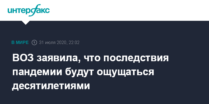 Москва. 31 июля. INTERFAX.RU - Глава Всемирной организации здравоохранения (ВОЗ) Тедрос Адханом Гебрейесус в пятницу заявил, что последствия пандемии коронавируса будут ощущаться на протяжении десятилетий.