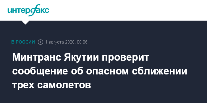 Москва. 1 августа. INTERFAX.RU - Власти Якутии проверяют сообщения о якобы произошедшем в ночь на субботу инциденте с участием трех самолетов, сообщает пресс-служба правительства региона.
