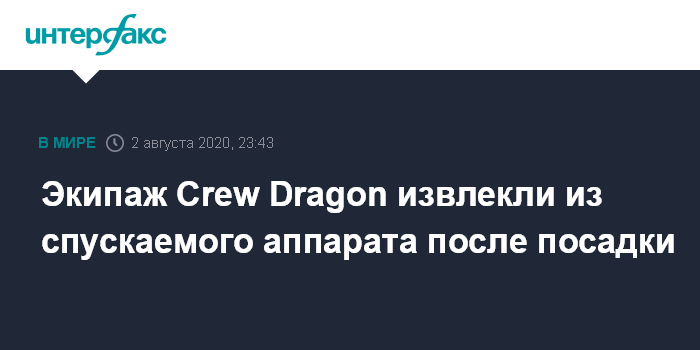 Москва. 2 августа. INTERFAX.RU - Двое членов экипажа многоразового пилотируемого корабля Crew Dragon - астронавты Роберт Бенкен и Дуглас Харли - после приводнения извлечены из спускаемого аппарата, сообщило НАСА.