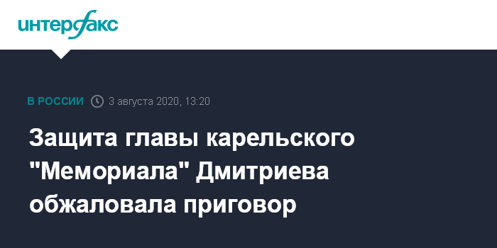 Москва. 3 августа. INTERFAX.RU - Защита главы карельского "Мемориала" Юрия Дмитриева, осужденного на 3,5 года колонии по делу о сексуальном насилии над приемной дочерью, обжаловала приговор.