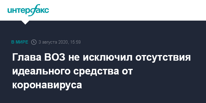Москва. 3 августа. INTERFAX.RU - Директор Всемирной организации здравоохранения Тедрос Адханом Гебрейесус не исключил в понедельник, что "волшебное средства" от коронавируса может никогда не быть найдено.