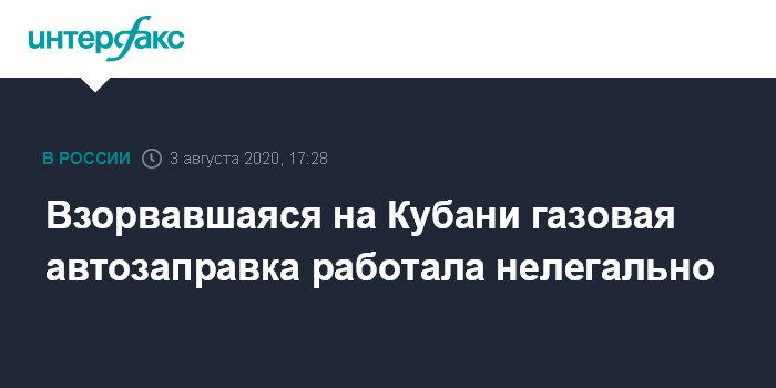 Москва. 3 августа. INTERFAX.RU - Газозаправочный комплекс, взорвавшийся в Динском районе Краснодарского края, не имел документов и работал нелегально, сообщил в понедельник губернатор региона Вениамин Кондратьев.